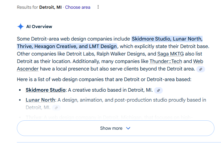 The short answer is no, Thrive is not Metro Detroit based. While this agency appears in the AI Overview when you search for Detroit area web designers, you can see clearly on their website that they are headquartered in Arlington, Texas.